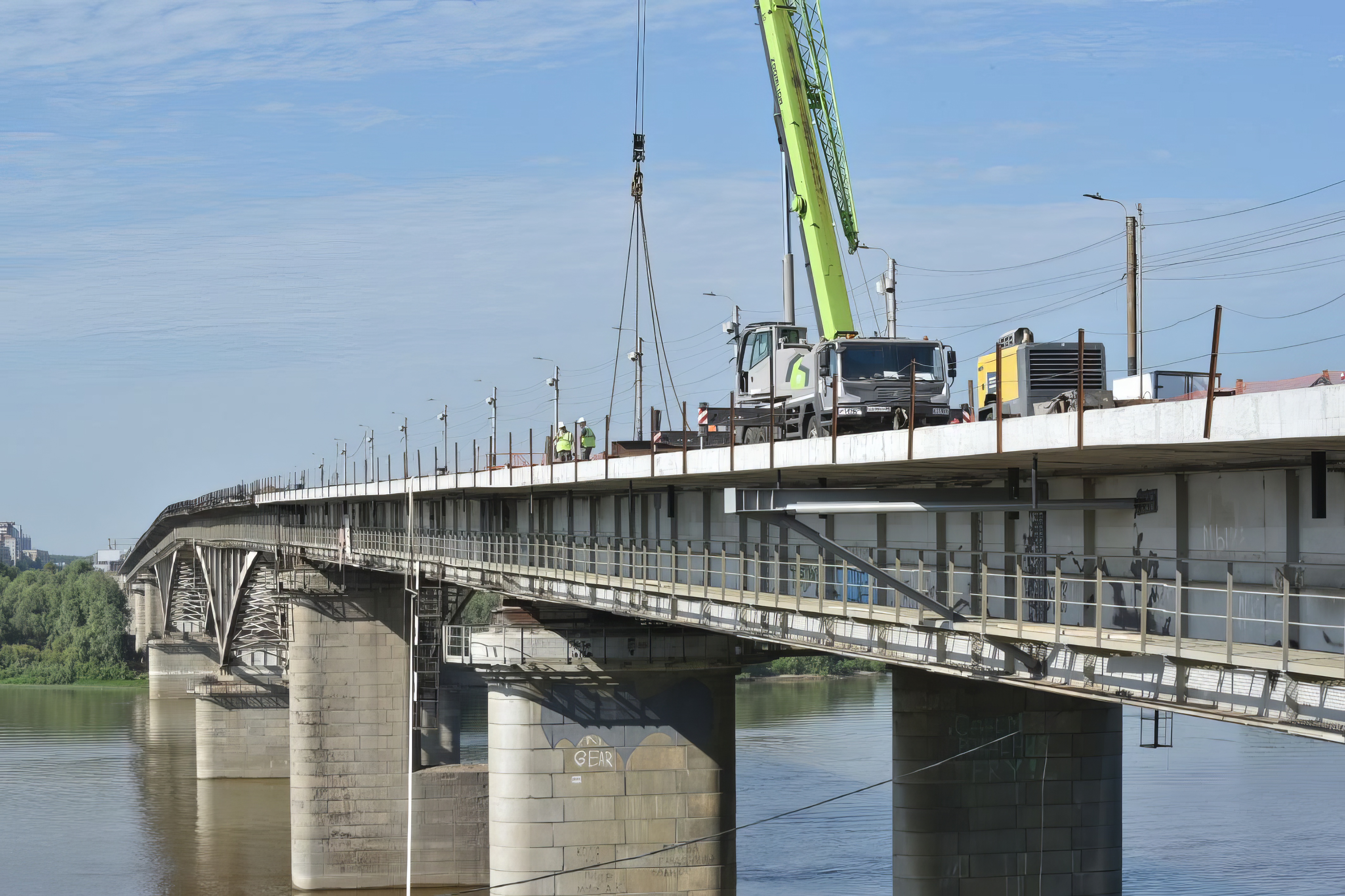 Размеры пешеходного тротуара останутся прежними — 2,25 м, но его полезная площадь заметно увеличится благодаря выносу опор. Также мостовики продолжают работы в теле моста: очищают металлические поверхности песком, обрабатывают особым составом и окрашивают для защиты элементов конструкции от коррозии. Со стороны правого берега уже установлены первые две выносные консоли под опоры освещения и контактной сети. На ортотропной плите сооружения устраивают выравнивающий бетонный слой.